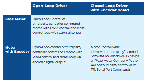 Piezo Motor Company motors are available as a basic motor or with a fitted encoder. Piezo Motor Company electronic drivers are available as open-loop or closed-loop drivers. Motors can be simply controlled in open-loop mode with several options for achieving closed-loop motion control. To learn more, visit https://piezomotors.com/