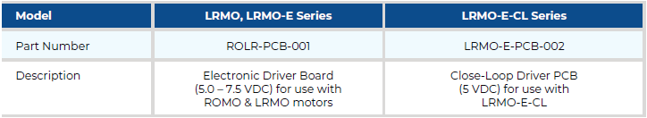 | LRMO-E-PCB | ROMO-E-PCB006 | Factory Pre-Programmed I2C Close-Loop Electronic Driver Board (Blue PCB) 5.0 V DC for use with ROMO-E for close loop I2C system only | Factory Pre-Programmed I2C Close-Loop Electronic Driver Board (Green PCB) 5.0 V DC for use with ROMO-E for close loop I2C system only |